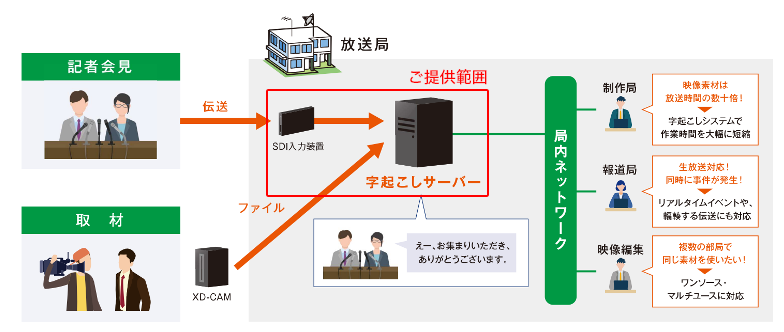NHKの音声認識技術と長年の番組制作ノウハウをベースに開発した字起こしシステムです。取材映像や記者会見などの音声をAIが自動認識して文字に書き起こします。