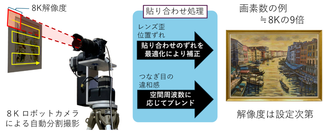 絵画などの2次元被写体のデジタル化では、撮影における拘束条件が少なく短時間でデジタル化できる8Kロボットカメラを用いたデジタル化技術を開発しました。このデジタル化技術では、対象となる絵画を自動でタイル状に領域分割して撮影し、レンズ歪補正などの画像処理を施し高精度に貼り合わせできます。