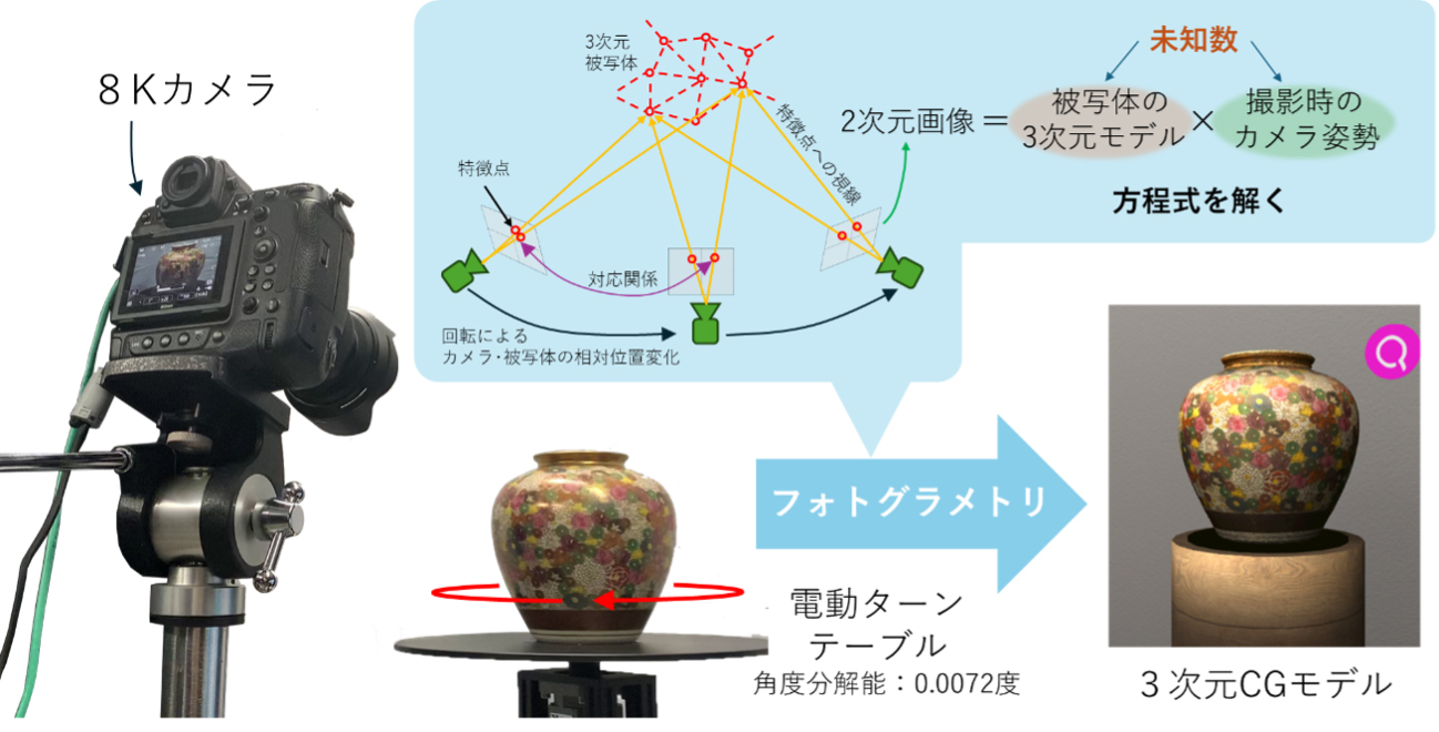 壺などの3次元被写体に関しては、被写体を電動ターンテーブルに載せ8Kカメラで自動撮影する効率的なデジタル化システムを開発しました。様々な視点から撮影した被写体表面上の特徴のある箇所(特徴点)を手掛かりに被写体の3次元形状と表面模様を抽出するフォトグラメトリ手法をベースとし、8Kカメラの映像を用いることで高精度な形状、高精細な表面模様を取得できます。