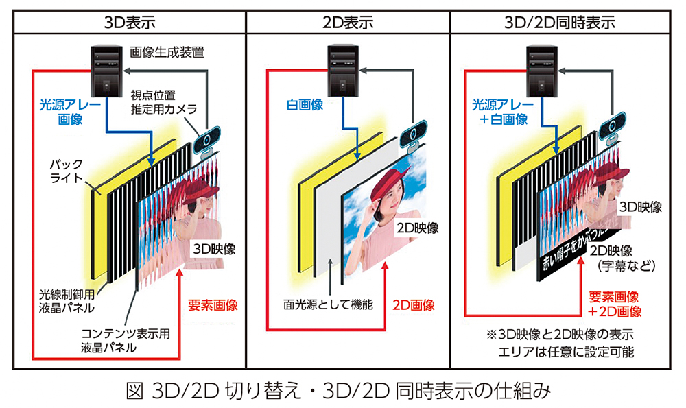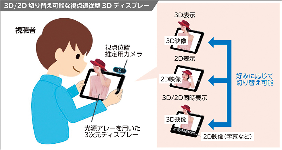 電気的に切り替え可能な光源アレー(※1) を用いることで、好みに応じて3次元(3D)映像と2次元(2D)映像を選択して視聴できる裸眼3Dディスプレーです。また、視聴者の視点を検出し、追従することにより視点位置に応じた自然な3D映像を表示できます