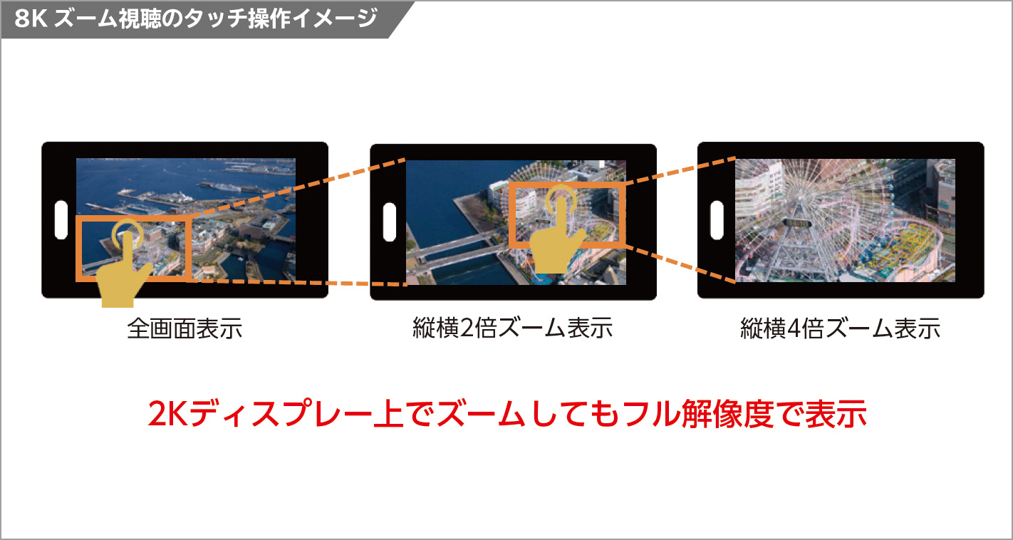 タブレットなどの視聴端末で動画を視聴する際にタッチ操作で好きな領域を拡大しても解像度が低下しない動画視聴Webアプリケーション技術です。8Kコンテンツの高精細な視聴体験を2Kディスプレー等の視聴端末で提供することができます。