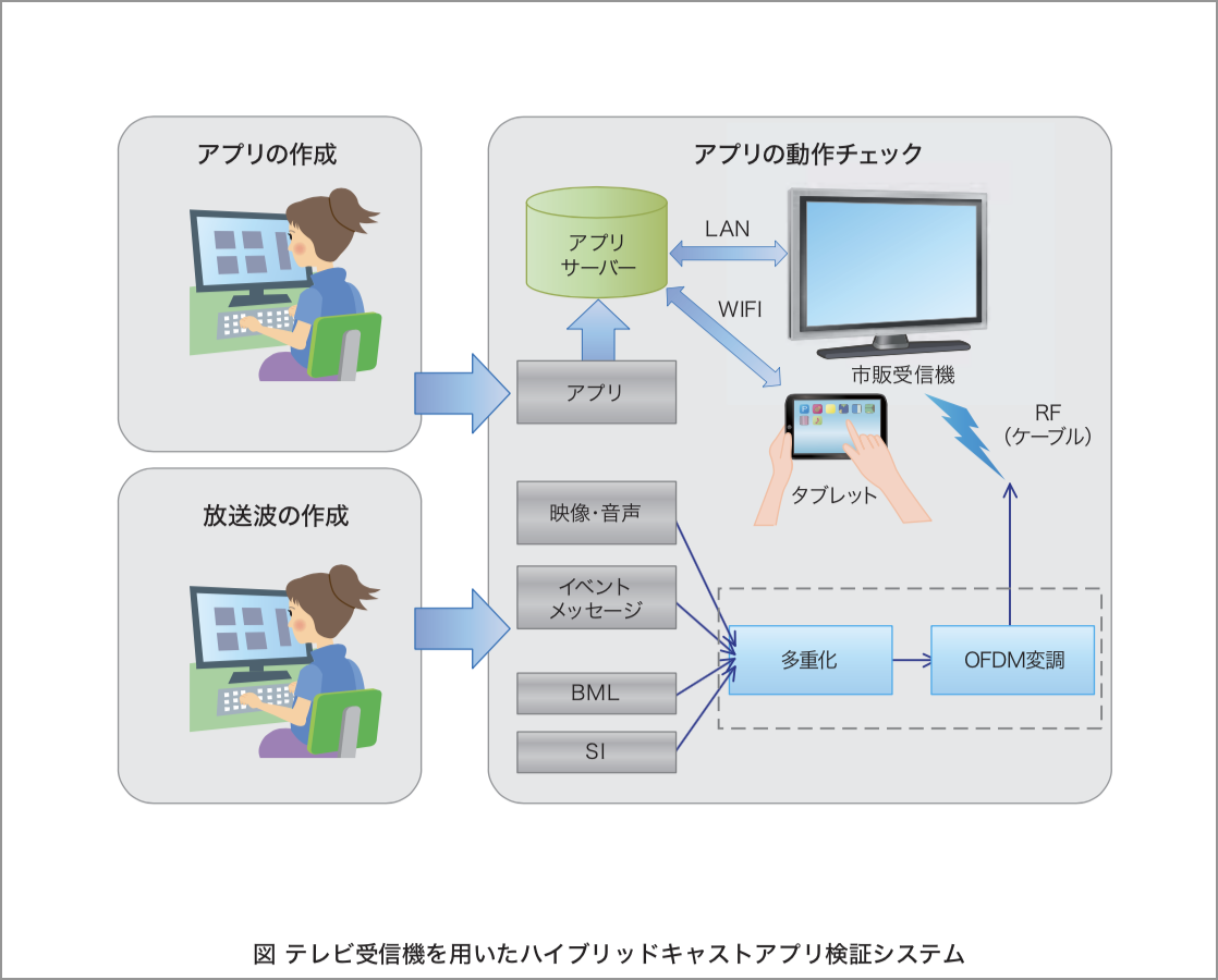 ハイブリッドキャストのアプリを制作する際に、市販の受信機での動作を検証するための技術です。