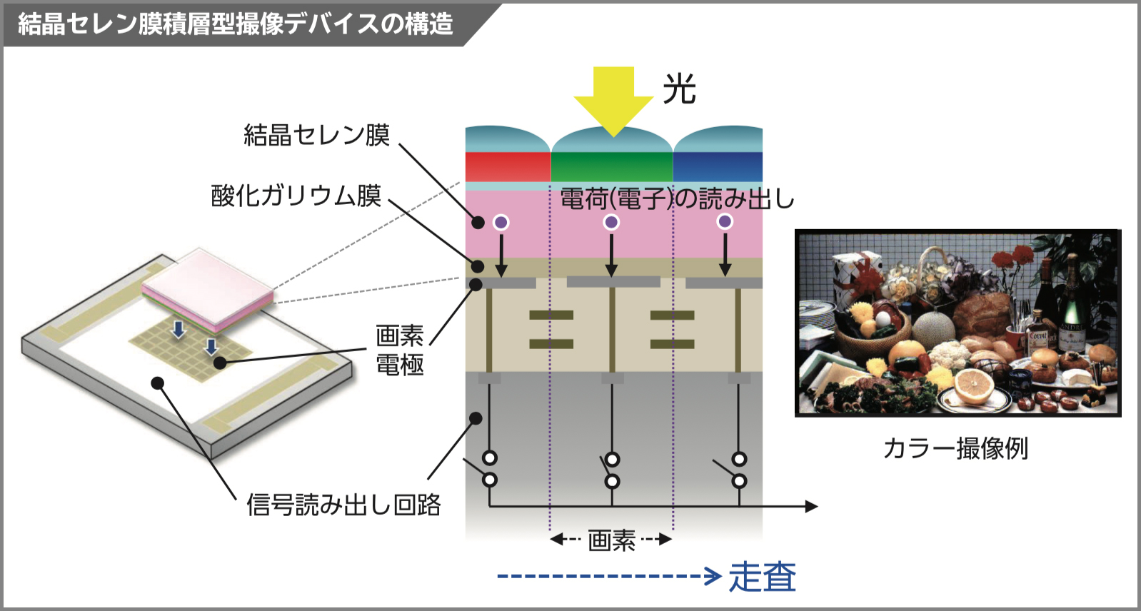 撮像デバイスに適用可能な、結晶セレン光電変換膜の作製技術です。高感度で混色の少ない高精細単板カメラの作製に応用することができます。