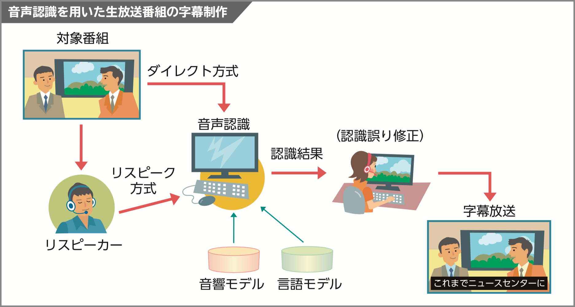 ・2 つの音声認識方式:生放送番組における音声認識技術を用いた字幕制作では、番組の音声を直接認識するダイレクト方式と、番組とは別の話者が番組の内容を言い直した音声を認識するリスピーク方式があり、番組音声の認識の難易度に応じて使い分けています。特にリスピーク方式は、背景雑音や感情的な話し方がある番組に有効で、複数話者の対談を整理して入力することもできます。ダイレクト方式とリスピーク方式の長所を組み合わせたハイブリッド方式によって、さまざまな番組で高精度な音声認識が実現可能です。