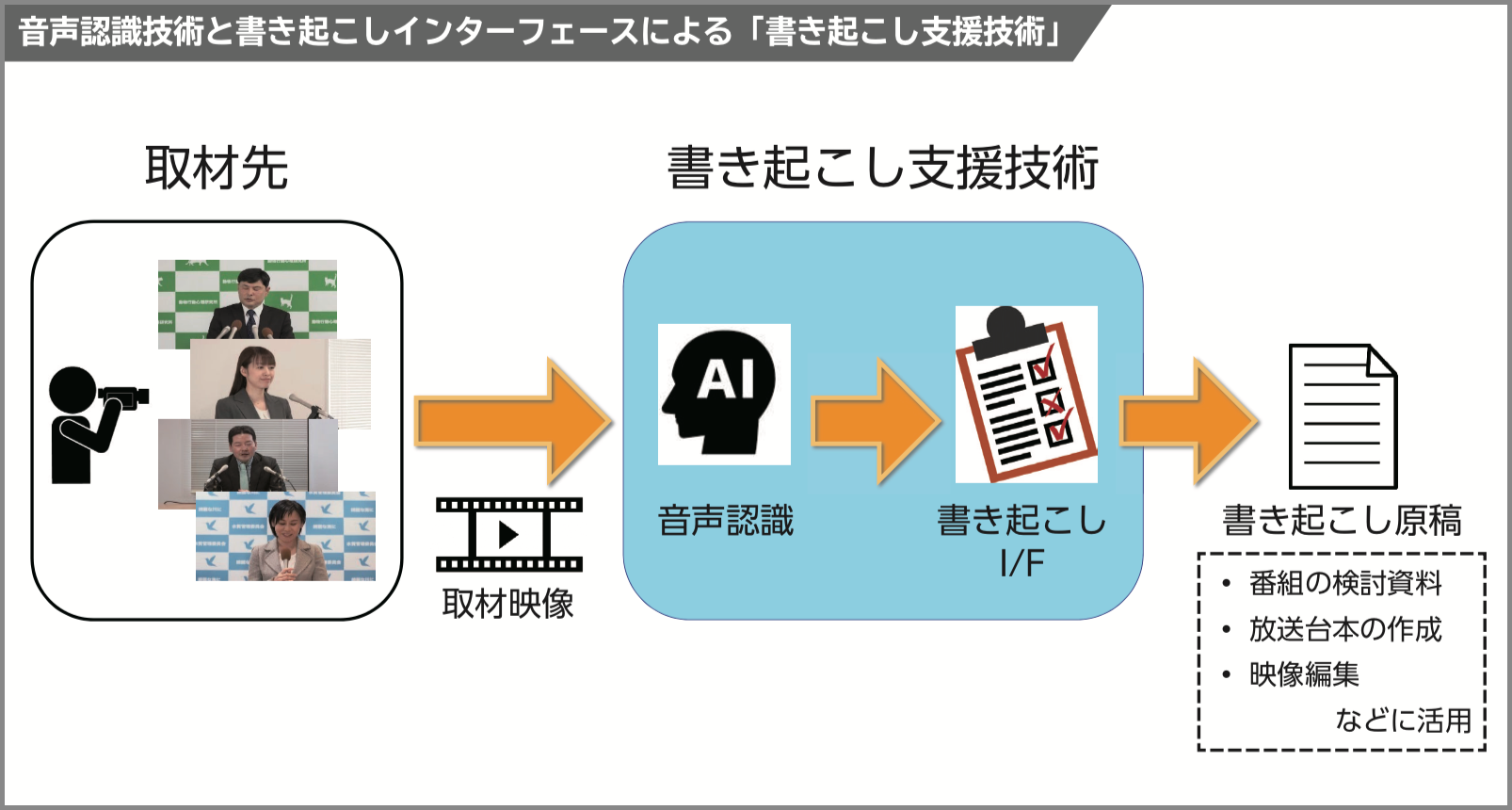 音声認識技術と組み合わせることによって、記者会見やインタビューなどの取材映像から効率よく書き起こし(文字起こし)を進めるための支援技術です。