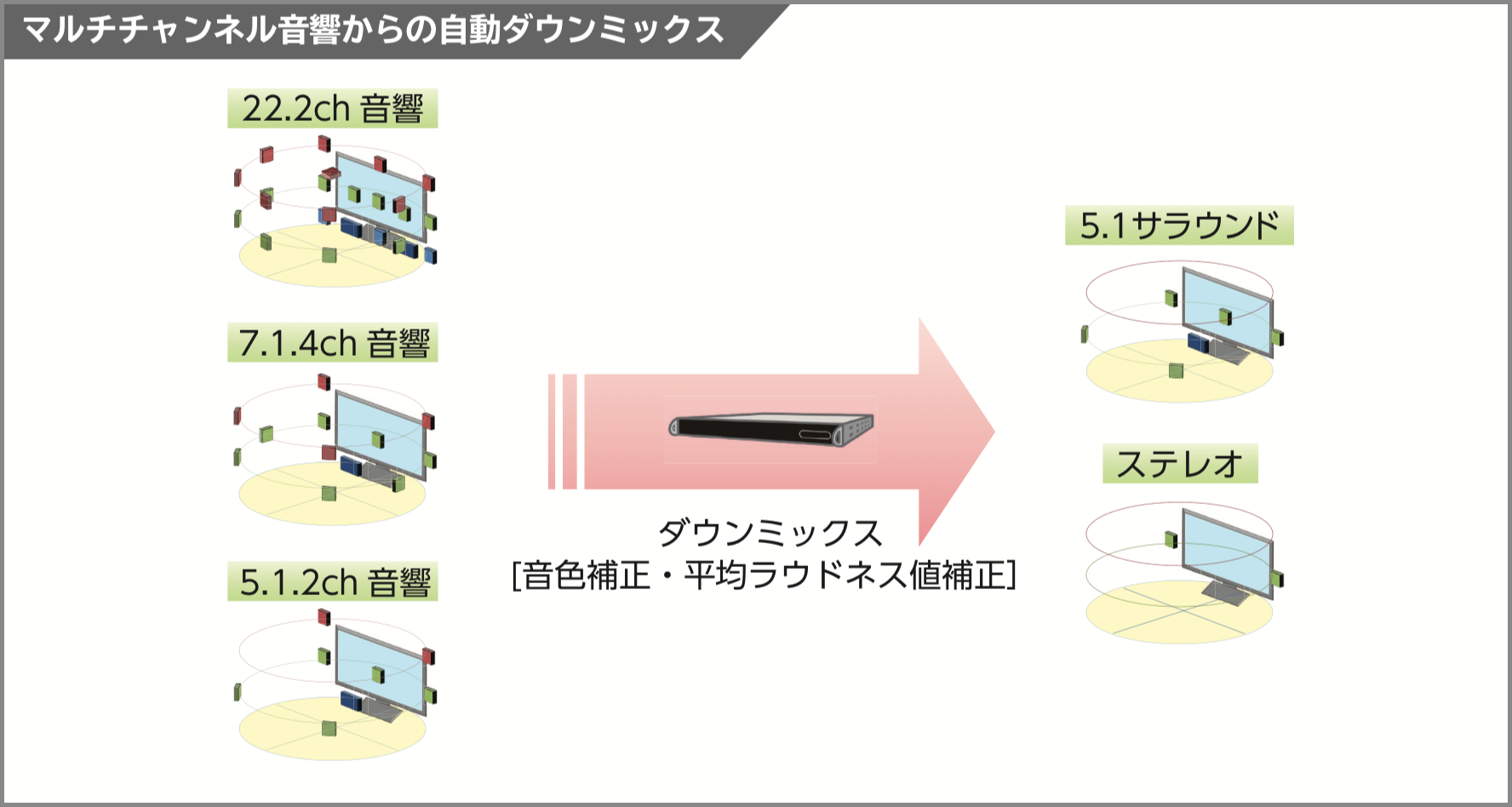 (1)22.2chや7.1.4chなどの様々なマルチチャンネル音響から、音質・平均ラウドネス値を保持したままダウンミックスできます。