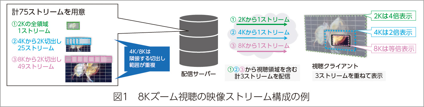 8K映像を①2Kへ変換した映像、②4Kへ変換し2Kサイズを切り出した複数の映像、③変換なしに2Kサイズを切り出した複数の映像の各ストリームを生成して配信サーバーに用意します。視聴端末はタッチ操作に応じて①、②、③からそれぞれ視聴領域を含む映像ストリームを配信サーバーから取得し、3つの映像を重ねて配置し、操作に応じて前面の映像を切替表示することで、高精細な視聴体験を直観的なタッチ操作で実現します。