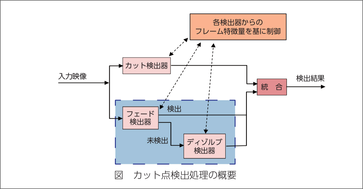 編集点で使用される切り替え方法のうち、カット、フェード、ディゾルブを検出することができます。カット点検出の精度を上げるために、カットとフェード、ディゾルブの検出器を並列に配置しています。各検出器で算出されるさまざまなフレーム特徴量を3 種類の検出器で共有して同じ特徴量を重複して計算しないようにし、最後に複数の検出器で検出されたカット点を結合して最終的な検出結果を出力します。映像編集において最も頻繁に利用されるカットについては、100% に近い精度で検出することが可能です。