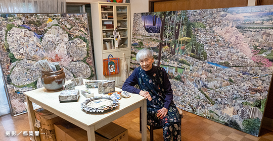 巨大で密度の高いコラージュを生み出す嶋暎子さん(83歳)。切り抜いたチラシを埋め尽くすように貼った作品は迫力があり、想像力をかきたてる世界が広がっています。